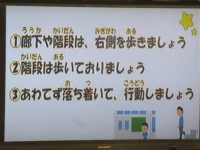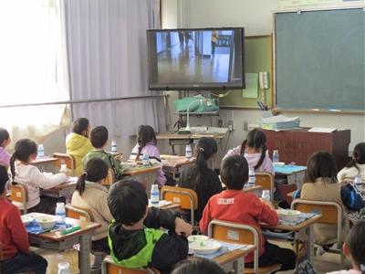 牛川っ子が廊下を走っている映像や、廊下を走るとどんな危ないことが起きるかがわかる映像などを流しました。給食を食べながら、「あるある、そういうこと・・・」などとつぶやきながらみんな真剣に映像を見ていました。