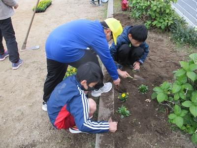 園芸委員が、枯れてきたマリーゴールドを抜き取り、パンジーの苗を植えました。毎朝、花壇の水やりもしてくれています。