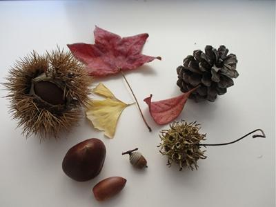 牛川校区の公園などで拾いました。マツボックリ、ドングリ、モミジバフウ、イチョウ、クリ・・