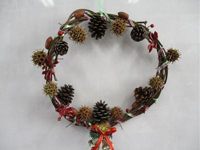 牛川校区の木の実を、葛のツルにくっつけて、クリスマスリースのできあがり!