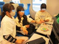 新幹線ではカードゲームを楽しんだり、窓からの景色を眺めたり…(滋賀は雪が積もっていました)