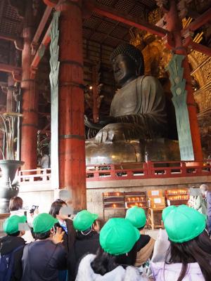 法隆寺見学の後、東大寺へ向かいました。実際に見る大仏の印象はどうだったかな。南大門の金剛力士像にも目を見張る子どもたち。「こんなにマッチョなの⁈」 鹿のフンをよけながらも「かわいいね」と大喜びでした。