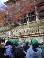 次は清水寺へ向かいました。まずは腹ごなしにカレーライスをぱくり。給食のカレーよりスパイシーな味でしたが、みんな大丈夫だったかな。夏の暑さと12月の寒波の影響で昨年度よりも今一つと聞きましたが、それでも清水の舞台から眺める山々にはまだ紅葉が残っていてきれいでした。舞台を下から眺める子どもたち。「くぎが1本も使われていないなんて信じられないなあ」